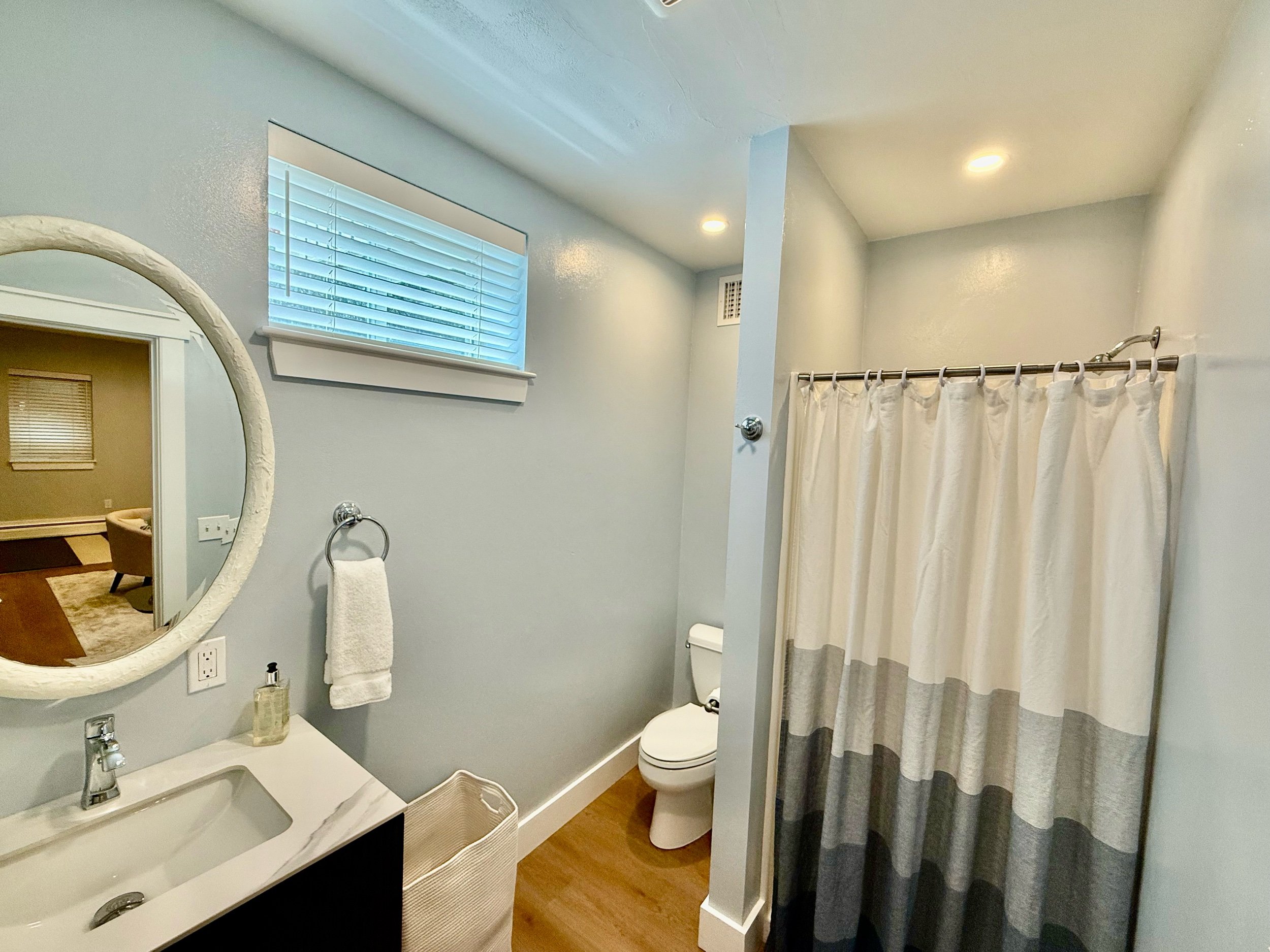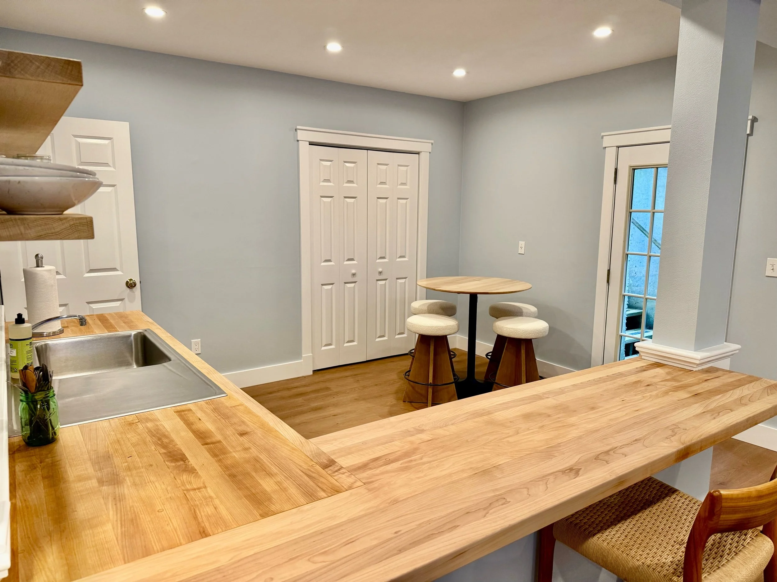 The home has a second entertainment floor on the lower level—perfect for kids and late night movies. There’s a recreation room with a fully equipped, 65 inch television with Sonos soundbar and subwoofer, lots of seating, a kitchenette with a small fridge, eating areas, a Peloton Bike+, dumbells, yoga/work-out flooring section, and a full bathroom with shower. It’s great for exercise on a hot summer day and a quiet place to meditate or catch up on work with reliable Ethernet and Wi-Fi. This level also has a separate laundry room and can be accessed internally or through an external door.