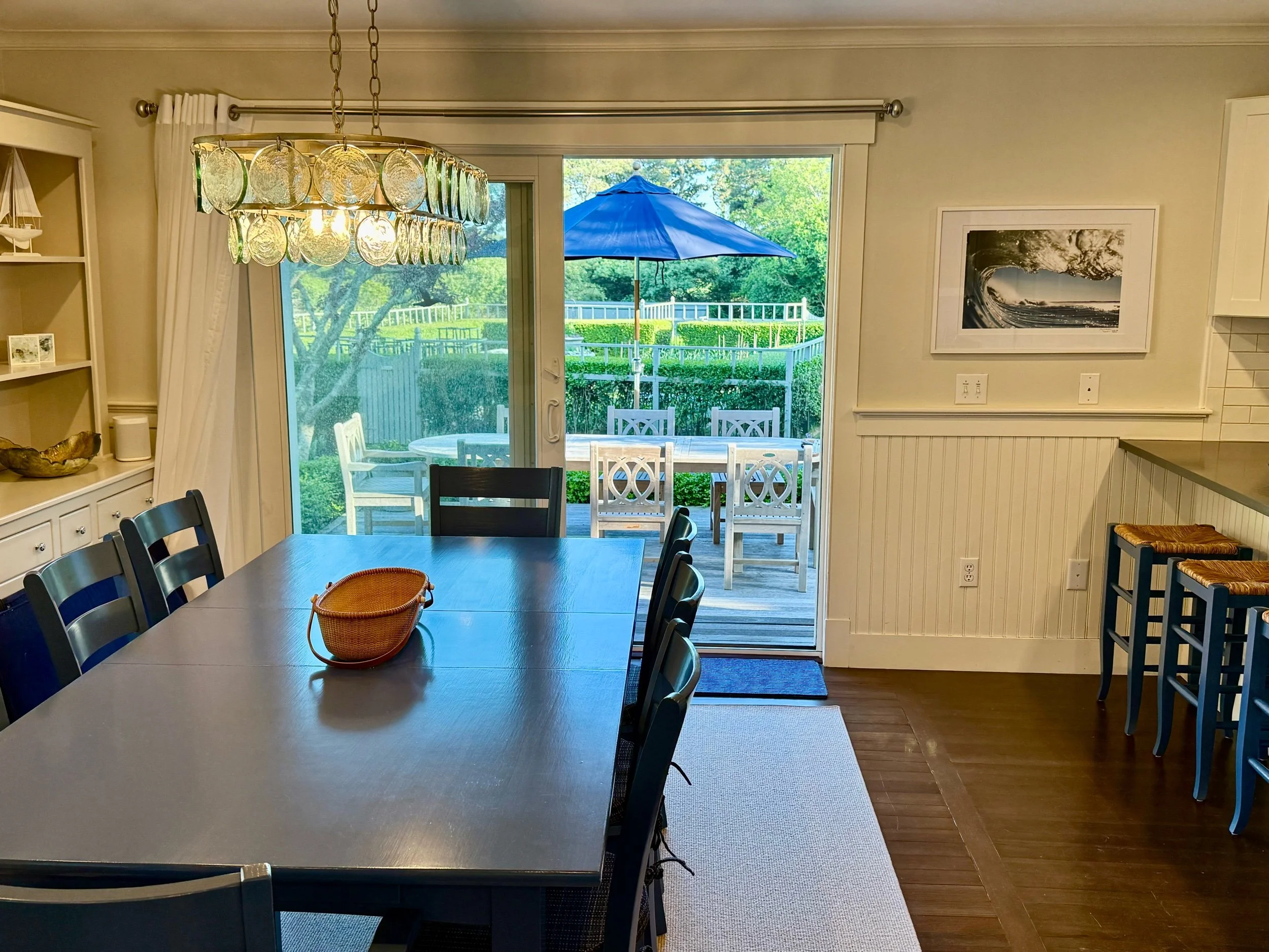 The front door opens to a comfortable living room to the left and straight to a hallway leading to the kitchen. The renovated kitchen is fully equipped. It has breakfast bar counter seating, an adjacent dining area, a wet bar and multiple coffee options. In the living room there is a 60 inch television with Sonos soundbar, a desk and a Wi-Fi enabled printer. The kitchen and dining room area has a Sonos One that can be temporarily place outside when dining al fresco.