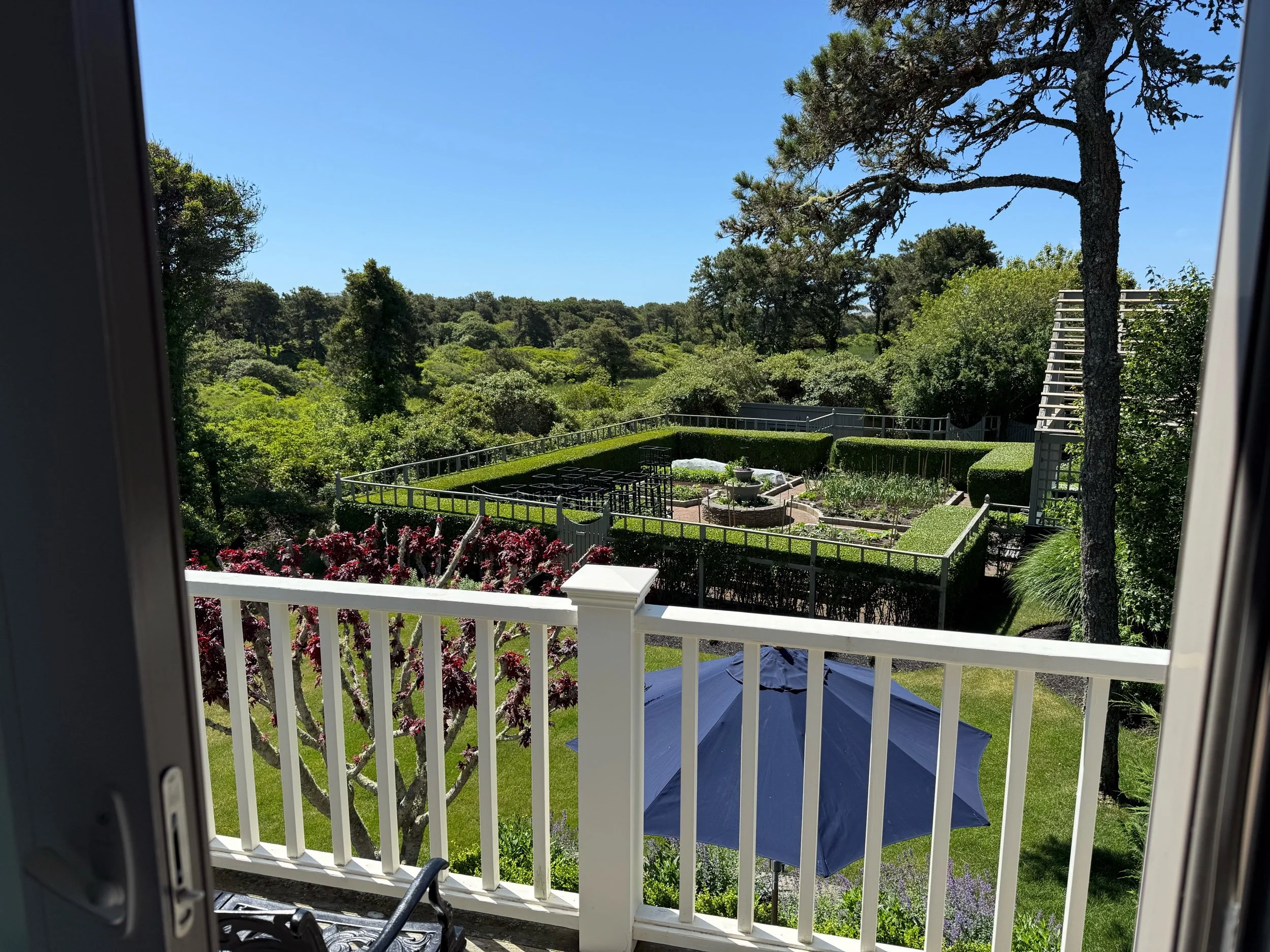 The guest house landscape is professionally designed and maintained to maximize its privacy within the estate. It features large back and side lawns as well as a tree-filled front lawn within the guest house circular driveway overlooking the picturesque barn on the grounds. There’s over an acre of land for guest house residents to enjoy within the confines of the estate. Do cartwheels and play bocce on the lawns and hang a hammock among the trees (hammock and bocce provided). The guest house also offers easy access to the compound’s shared formal gardens and adjoining Land Bank trails. The elevated position of the guest house and its backside stone patio with cushioned lounge chairs offers beautiful vistas into acres of uninhabited conservation land, especially in the early evening as the setting sun lights up the natural landscape at golden hour.