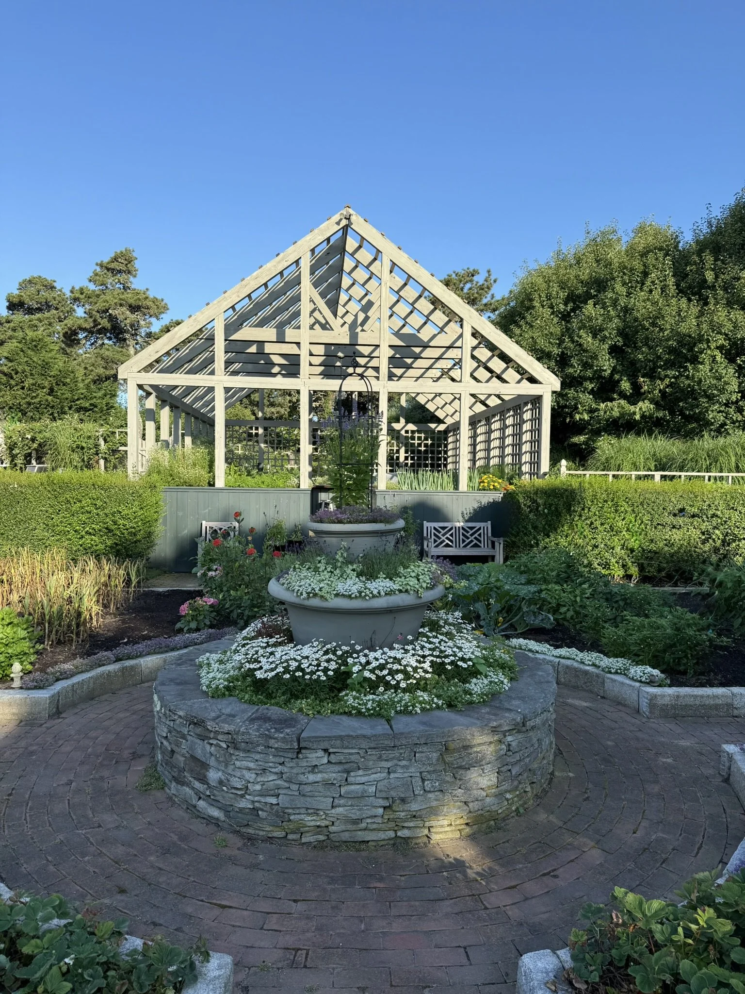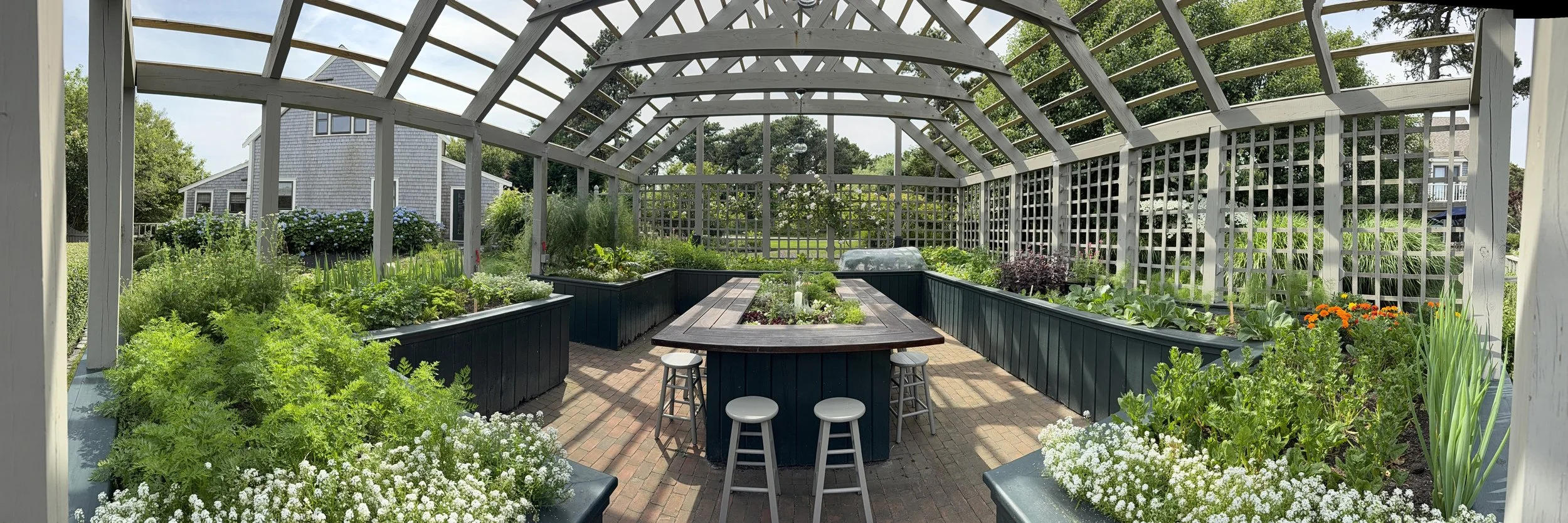 The upper garden, shaded by a pergola inspired by early Nantucket architecture, was designed to entertain and produce featuring a counter table for 12 centered around an edible flower garden. Upper garden perimeter plantings focus on short season crops including a variety of greens for salad, select vegetables and both edible and decorative flowers, with some herbs and teas.